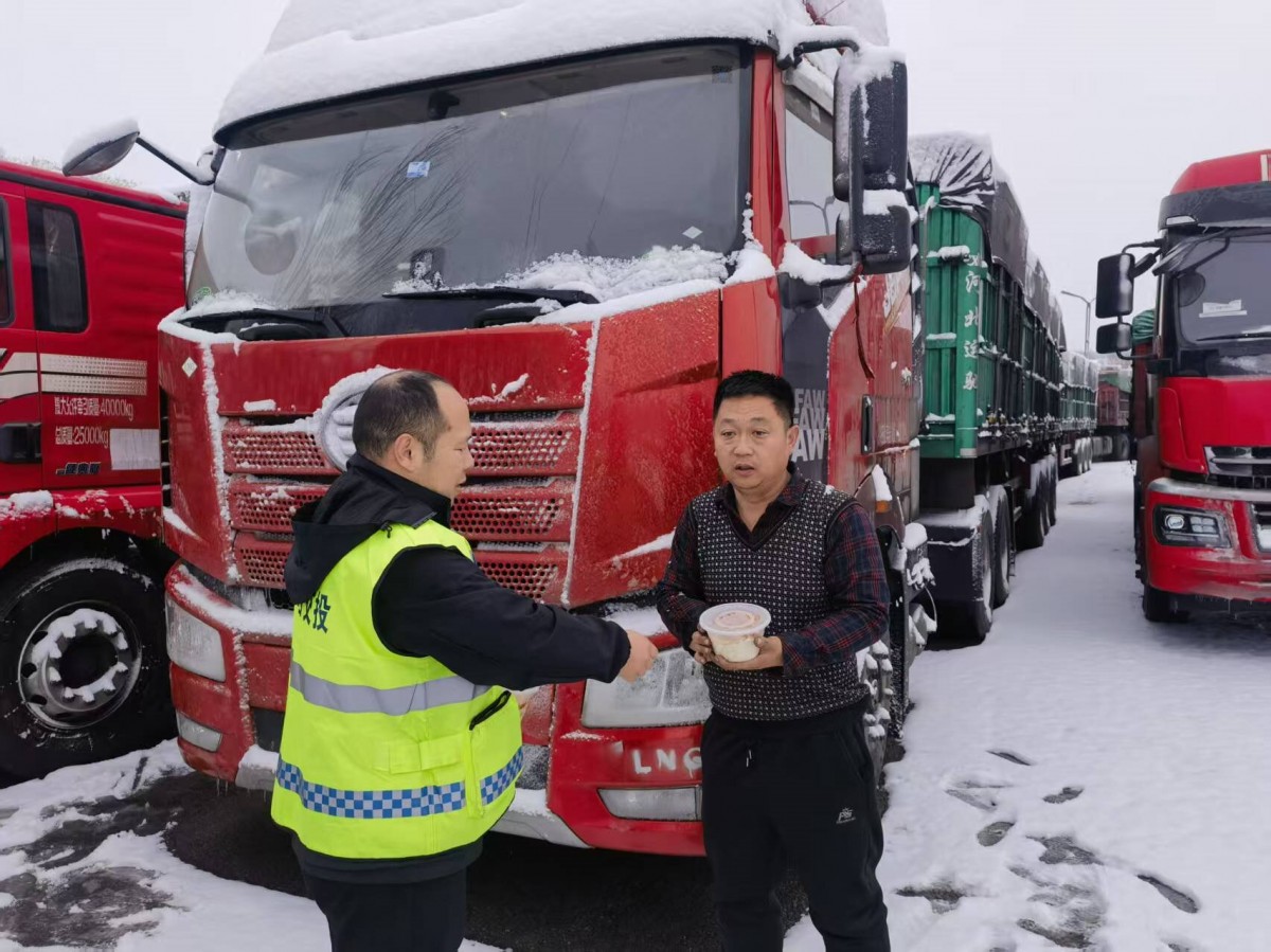 队员们顶风冒雪、不畏严寒,穿梭在滞留车辆之间,将热气腾腾的饭菜、热水逐一送到司乘人员手中,用贴心服务驱散严寒。同时,11个各收费站主动开放临时休息室,为滞留司乘提供临时休息、洗漱、免费早餐等力所能及的便民服务,全力保障滞留人员基本生活需求。